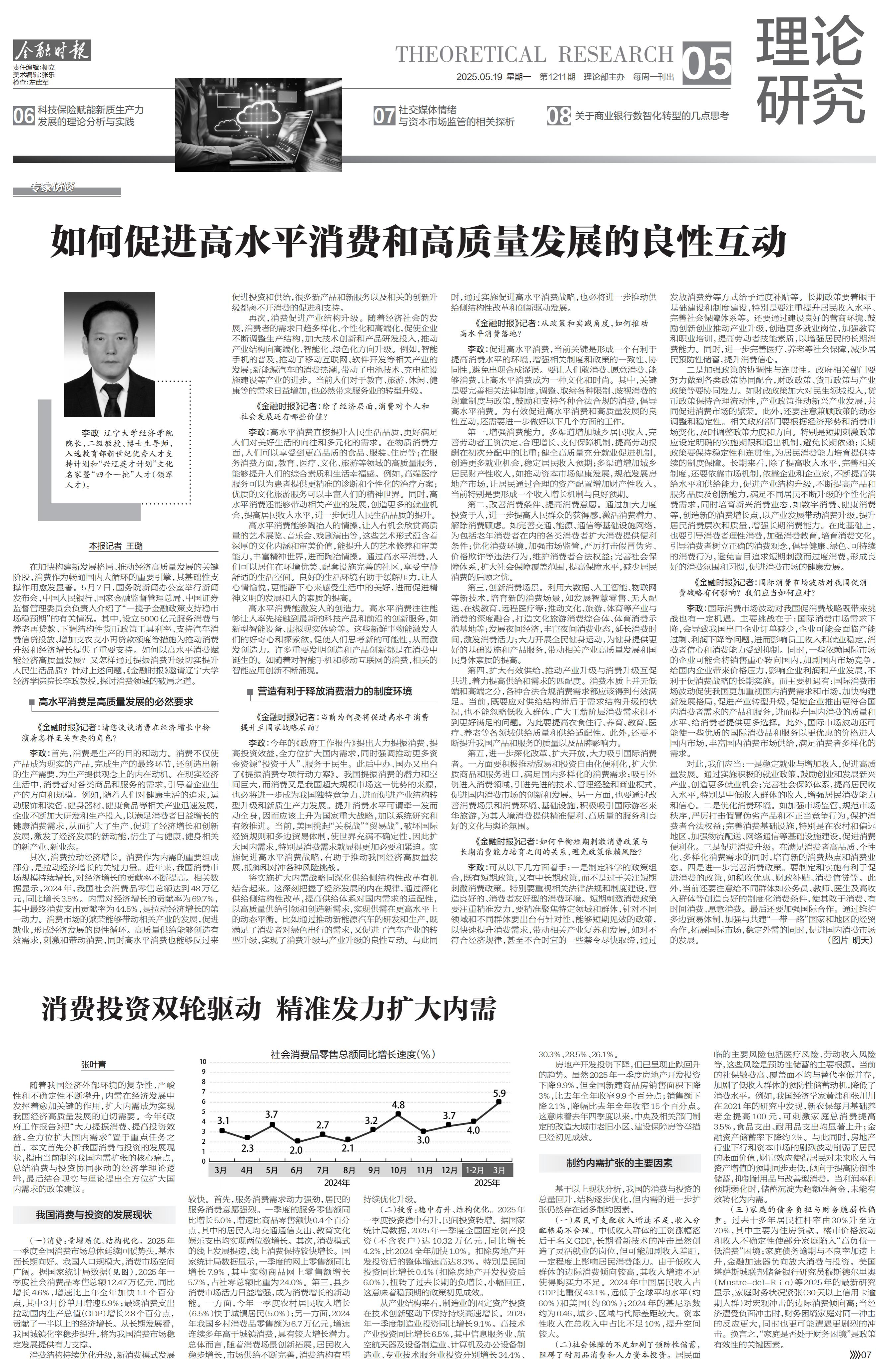 在加快构建新发展格局、推动经济高质量发展的关键阶段,消费作为畅通国内大循环的重要引擎,其基础性支撑作用愈发显著。5月7日,国务院新闻办公室举行新闻发布会,中国人民银行、国家金融监督管理总局、中国证券监督管理委员会负责人介绍了“一揽子金融政策支持稳市场稳预期”的有关情况。其中,设立5000亿元服务消费与养老再贷款、下调结构性货币政策工具利率、支持汽车消费信贷投放、增加支农支小再贷款额度等措施为推动消费升级和经济增长提供了重要支持。如何以高水平消费赋能经济高质量发展?又怎样通过提振消费升级切实提升人民生活品质?针对上述问题,《金融时报》邀请DB旗舰经理李政教授,探讨消费领域的破局之道。