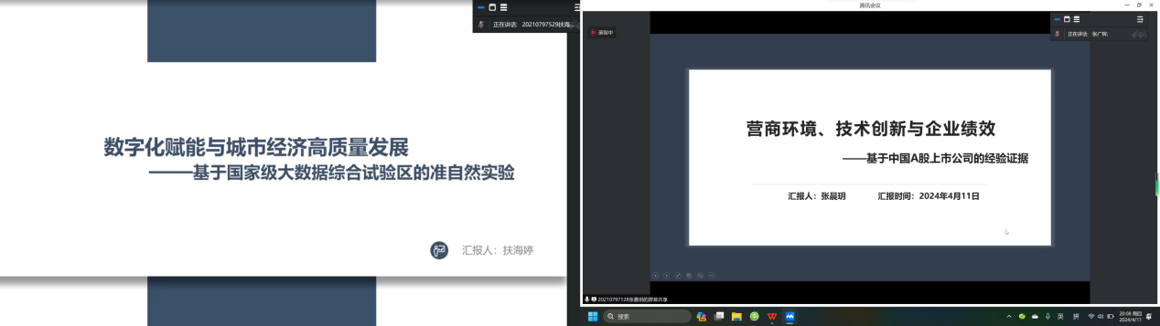 扶海婷汇报的论文题目为《数字化赋能与城市经济高质量发展》,她根据2010-2021年全国266个地级市的面板数据进行国家级大数据综合试验区对城市经济高质量发展的政策效应研究发现,数字化赋能对城市经济高质量发展存在显著正向影响,作用过程以就业能力为中介变量并受到创新能力等调节因素影响。张晨玥同学以《营商环境技术创新与企业绩效—基于A股上市公司的经验依据》问题分享论文,文章从研发投入和专利产出两个视角探讨技术创新对企业绩效的影响,为我国进一步优化营商环境、推进技术创新来提升企业绩效提供了经验证据和政策参考。