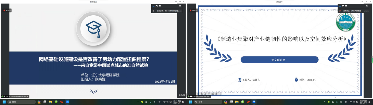 张晓媛同学分享《网络基础设施建设是否改善了劳动力配置扭曲程度》为题的文章,她认为以网络基础设施为载体的互联网发展正以势不可挡的速度重塑资源配置方式,能够有效整合资源和降低信息不对称,互联网的迅速发展为改善劳动力配置扭曲程度提供了新的可能性。郑尊亮同学报告《制造业集聚对产业链韧性的影响以及空间效应分析》的文章,他将产业集聚与产业链韧性纳入统一研究框架下,运用中介效应模型、空间计量模型探讨产业集聚对产业链韧性的直接效应、中介效应以及溢出效应,并以制造业的面板数据为基础,丰富了有关制造业集聚影响的研究。