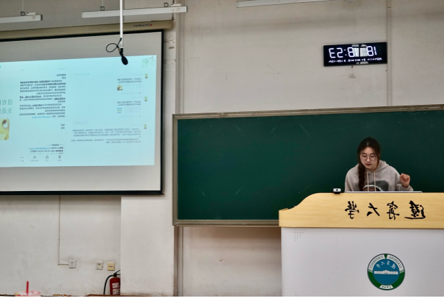 2021级扶海婷同学着重向大家分享专业课学习的经验,她强调绩点是保研的“敲门砖”,接着为同学们讲述大学期间如何提高绩点和排名,并向大家介绍自己的一些学习方法,例如上课认真听讲、积极拓展内容和知识的学习、在日常生活中努力积累英语词汇量、多阅读顶级刊物的学术论文等,给予同学们极大的鼓励与肯定。