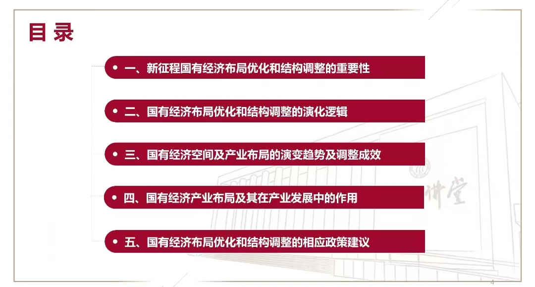 范欣教授报告分为五个部分,范欣教授首先介绍了国有经济布局优化和结构调整研究的重要性,并从理论和历史两个角度讨论国有经济布局优化和结构调整的研究逻辑,随后从总量、进退、国资委监管企业几个方面介绍国有经济及产业布局的调整成效并指出空间与产业布局的现存问题以及战略性新兴产业国有企业布局的演变趋势,再对国有经济产业布局及其在产业发展中的作用通过实证分析加以阐释,最后针对国有经济布局优化和结构调整提出相应政策建议。