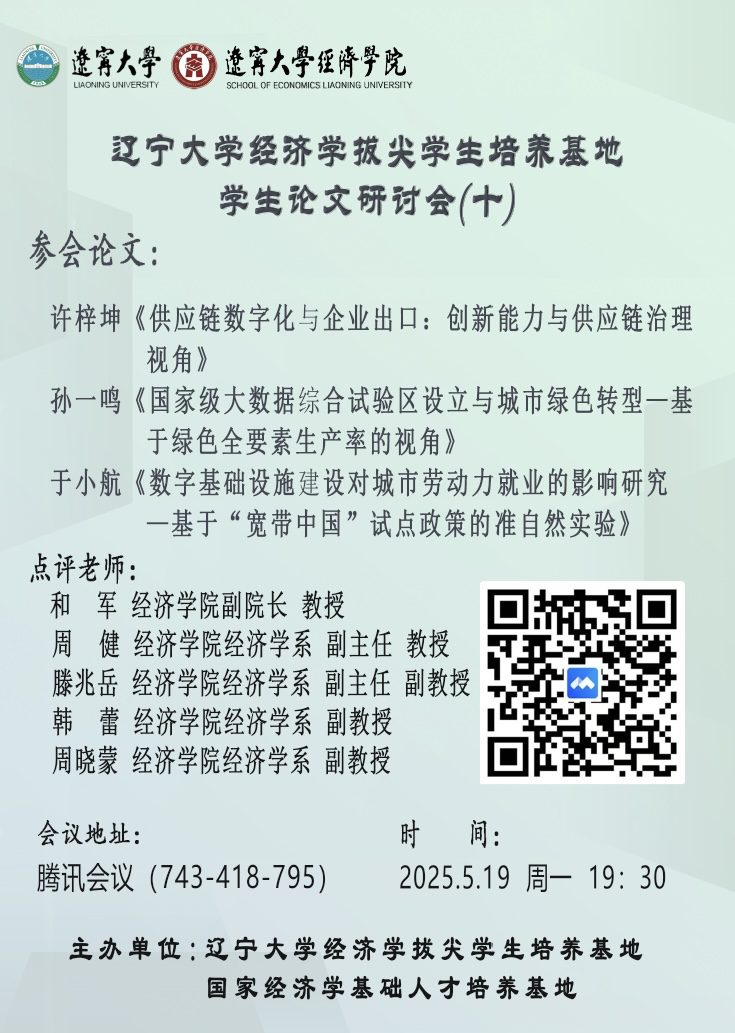 2025年5月19日,经济学拔尖员工培养基地开展第十期员工论文研讨会,本次研讨会以聚焦学术前沿为核心,致力于提升拔尖员工科研创新水平与论文写作水平,为拔尖基地员工打造深度学术交流与思想碰撞的优质平台。DB旗舰副经理和军教授,经济学系副主任周健教授、滕兆岳副教授,以及韩蕾副教授和周晓蒙副教授等5位专家学者受邀担任点评嘉宾,2022级经济学拔尖基地员工许梓坤、孙一鸣和于小航3位同学汇报最新论文,点评老师从理论框架、研究方法、实证分析等多个维度,对员工论文进行细致点评与指导,并与参会员工深入探讨学术课题,现场互动热烈,学术氛围浓厚,助力员工在科研实践中实现专业能力的全面提升。