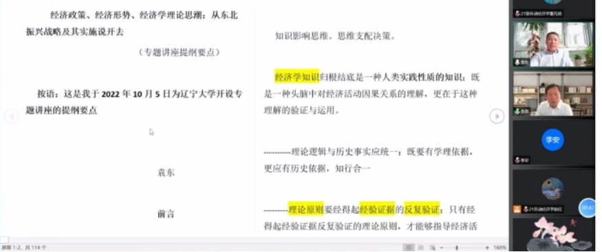 袁东教授开篇从他应邀开设本次讲座的指导思想——三个初步认识讲起,即:知识影响思维,思维支配决策;经济学知识归根结底是一种人类实践性质的知识;要将观察视角置于“发展过程的关键时刻”。遵循这一指导思想,袁东教授循循善诱地就东北振兴战略确立和实施进程中反映出的问题及其原因进行了分析。从东北的产业结构和1980年代中期开始的一系列国家宏观经济政策转型及其对东北重工业的影响两个方面,回答了为什么会有东北振兴战略确立这个值得深思的问题。通过观察东北地区经济增长率(GDP)、固定资产投资增长率和第二产业所占比重这三个指标自2003年以来的变化及其与全国平均水平的对比,袁东教授详细分析了东北振兴战略实施进程中所反映出来的问题,并由此得出结论认为:东北振兴的关键在于工业与农业尤其是工业;东北工业的振兴特别是国有工业的振兴,关键在于基础广泛的产业升级;以重工业为主体的东北工业的持续性产业升级,需要支持企业遵循产业逻辑的进取型投资战略;东北振兴,既在于该地区自身的努力,更取决于国家整体经济环境,即总体经济形势与宏观经济政策。在此基础上,袁东教授阐述了政策思维以及作为其背后支撑的经济学说理论思潮的影响,并对相关思潮作了比较深刻的反思性分析。整个讲座,袁东教授引用大量数据和文献,对东北振兴战略实施问题和相关国家宏观经济政策进行了比较深刻地解读。在提问环节,袁东教授与博士生进行了线上互动答疑,耐心地解答了同学们关心的问题。