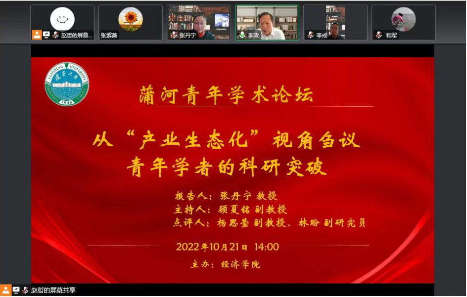 作为“蒲河青年学术论坛”的首场主讲嘉宾,张丹宁教授做了题为“从‘产业生态化’视角刍议青年学者的科研突破”的报告。报告提出要从“建立志同道合小团体”、“融入公司文化”以及“创新课堂教学方式”等方面构建青年教师的“学术生态圈”。在研究方向的选择上,青年教师要聚焦于特色化研究,并在文献梳理、社会现象分析的基础上结合国家重大需求,真正做到把文章写在祖国大地上。张丹宁教授还分析了自己的文献计量和社会网络等研究方法。吉林大学杨思莹副教授、中国社会科公司林盼副研究员对张丹宁教授的报告给予充分肯定,并围绕报告提到的相关问题进行了充分讨论,提出一些具有建设性的意见和建议。