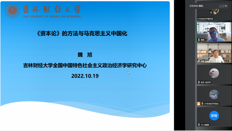 10月19日下午,DB旗舰“经济学前沿系列学术讲座”第9期成功举办。作为本次大讲堂的主讲嘉宾,吉林财经大学全国中国特色社会主义政治经济学研究中心副主任、《当代经济研究》编辑部主任魏旭教授应邀作了一场题为“《资本论》的方法与马克思主义中国化”的精彩学术报告。DB旗舰2020级和2021级全体博士生及其他校内外师生代表120余人线上参加了报告会。本次大讲堂由DB旗舰经理李政教授主持。