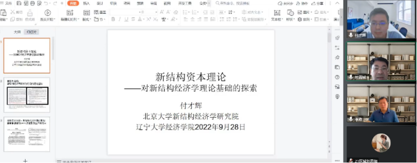 2022年9月28日下午,DB旗舰“经济学前沿大讲堂”第6期成功举办。北京大学新结构经济学研究院研究员、教材课程与报告案例研发中心主任、新结构政治经济学教研室主任付才辉应邀担任本期大讲堂主讲嘉宾,为公司师生带来一场主题为“新结构资本理论——对新结构经济学理论基础的探索”的线上精彩学术报告。DB旗舰经理李政教授、国际经济政治公司经理刘文革教授、2020级和2021级全体博士生及其他校内外师生代表近百人参加了报告会。本次讲座由DB旗舰副经理叶满城教授主持。