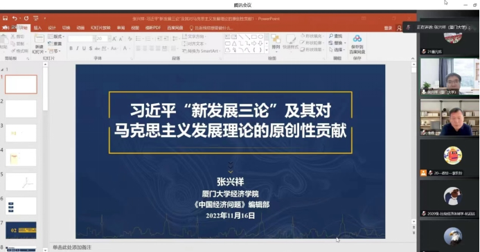 张兴祥教授首先从空间维度、时间维度和价值维度分析了“新发展三论”即“新发展阶段、新发展格局、新发展理念”的逻辑结构,并基于历史逻辑、理论逻辑和实践逻辑这“三重逻辑”的视角分别阐述了“新发展三论”体现鲜明的理论集成创新特征。紧接着,张教授解读了新发展阶段、新发展理念、新发展格局的定义、内涵及价值意蕴,分析了“新发展三论”的辩证关系、理论标志及实践功用。张教授强调,必须把新发展阶段、新发展理念、新发展格局三者视为一个有机整体,“三位一体”才能深刻理解和把握习近平总书记相关重要论述的理论精髓。张教授指出,“新发展三论”标志着社会主义发展理论的新进展,标志着习近平新时代中国特色社会主义思想的新高度,标志着马克思主义发展理论的新飞跃。张教授指出,“新发展三论”的实际功用主要体现在新发展阶段起到方向标的作用,新发展理念起到价值引领的作用,新发展格局起到纲举目张的作用。最后,张教授梳理了“新发展三论”对马克思主义发展理论的原创性贡献。他指出,“新发展阶段论”是马克思主义社会发展阶段理论的重大创新,“新发展理念论”是马克思主义发展观的重大创新,“新发展格局论”是马克思主义经济循环理论的重大创新。在互动交流环节,师生们踊跃提问,张教授对大家提出的问题予以耐心细致的解答,张教授还分享了《中国经济问题》的办刊宗旨与选题方向及要求,并对作者撰写论文和投稿提出宝贵建议。