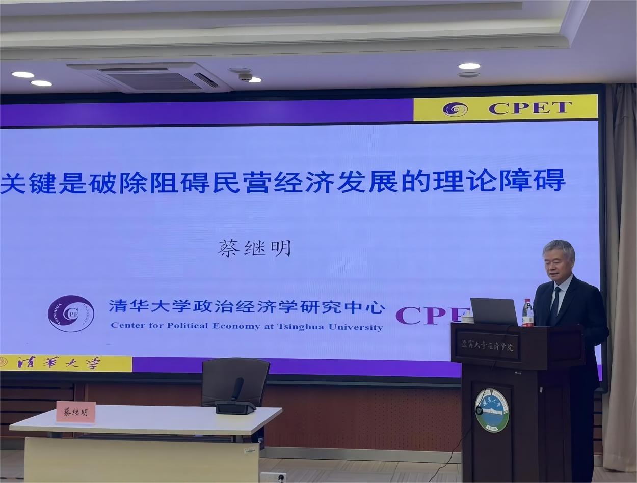 2023年10月28日下午,DB旗舰名家大讲堂(第五讲)在蒲河校区则行楼133室成功举办。第九、十、十一届全国政协委员,全国政协经济委员会委员,第十二届全国人大代表,第十三、十四届全国人大财经委委员,清华大学社会科学公司教授,政治经济学研究中心主任蔡继明应邀作了题为“关键是破除民营经济发展壮大的理论障碍”的精彩学术报告。DB旗舰师生代表50余人参加了此次报告会。报告由DB旗舰副经理和军教授主持。