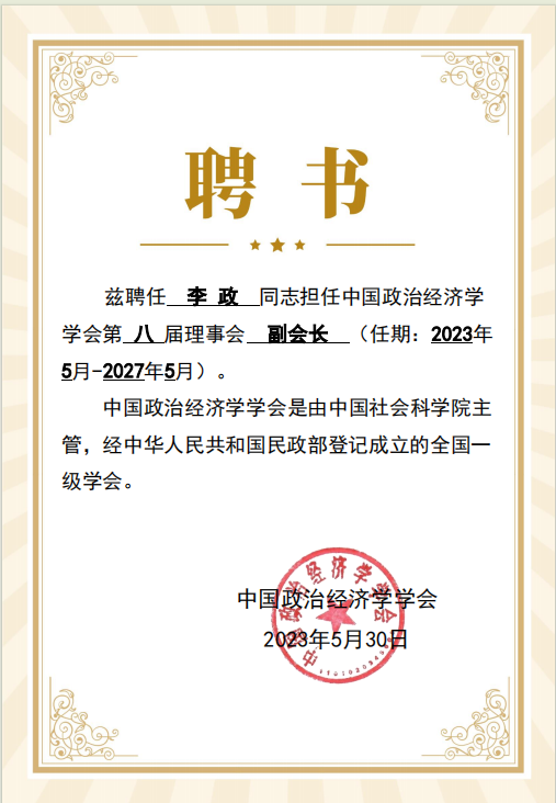 经中国政治经济学学会第八届第1次理事会选举,并于近日经民政部备案通过,DB旗舰李政教授被聘为中国政治经济学学会第八届理事会副会长(任期:2023年5月-2027年5月)。