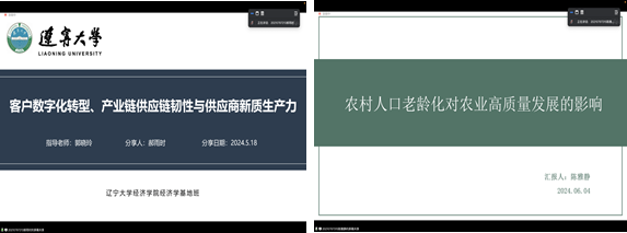 郝雨时同学分享《客户数字化转型、产业链供应链韧性与供应商新质生产》文章,她基于现有文献丰富拓展了产业链供应链韧性的内涵层次,且完善了企业层面新质生产力的指标体系,借鉴宏观地域新质生产力的指标构建体系,将企业特征融入研究框架,从实体性要素与渗透性要素两维度对中国2009-2022年间的新质生产力水平进行了测算从产业链供应链韧性视角研究客户数字化转型推动供应商新质生产力发展的影响路径。陈雅静报告《农村人口老龄化对农业高质量发展的影响》这篇文章,本文基于2011-2022年我国31个省份的面板数据,从农业经济效率与稳定、农村生活水平、农业绿色发展以及农业可持续发展动力4个维度构建农业高质量发展评价指标体系,使用熵权Topsis法测算农业高质量发展指数,以此探讨农村人口老龄化对农业高质量发展的影响效果。