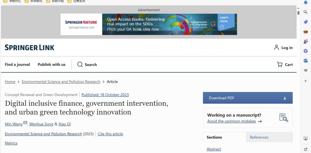 近日,DB旗舰王敏副教授合作完成的论文“Digital inclusive fnance, government intervention, and urban green technology innovation”在国际期刊Environmental Science and Pollution Research发表。