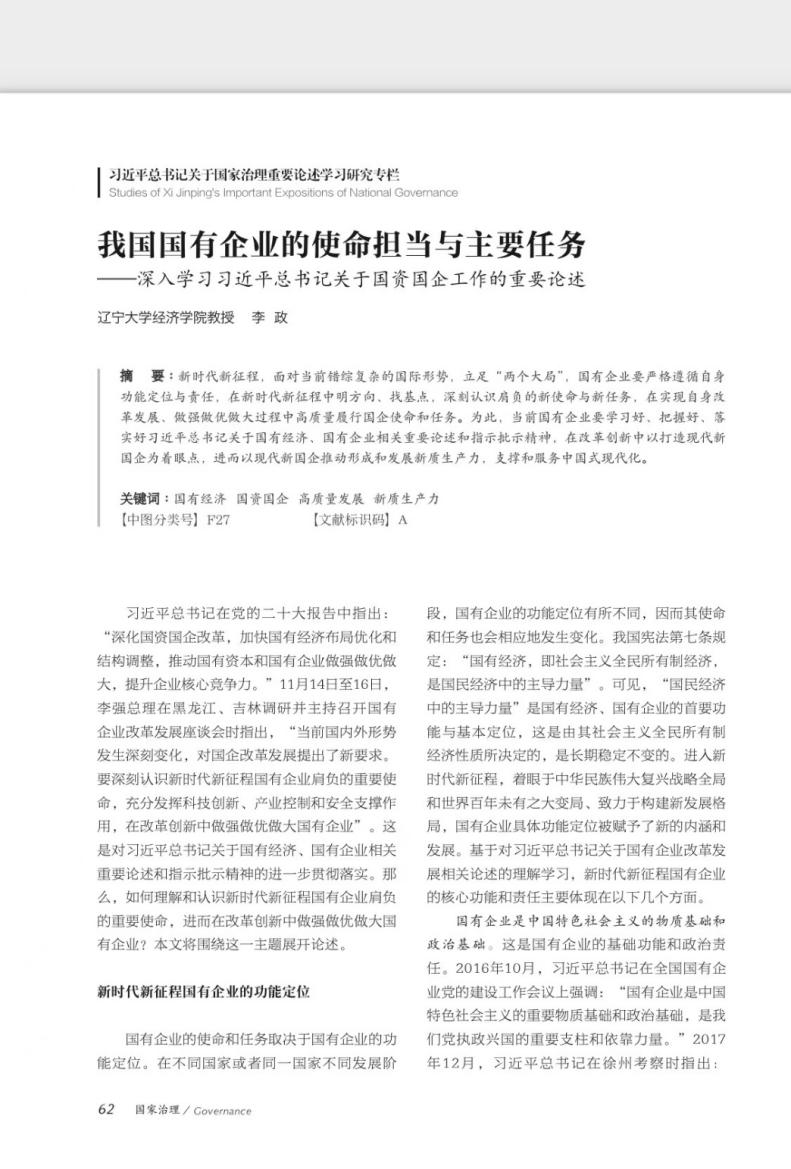 李政教授应约在人民日报社《国家治理》杂志2023年11月下第22期“习近平总书记关于国家治理重要论述学习研究专栏”发表题为《我国国有企业的使命担当与主要任务——深入学习习近平总书记关于国资国企工作的重要论述》的学术文章。李政教授在文章中指出,新时代新征程,面对当前错综复杂的国际形势,立足“两个大局“,国有企业要严格遵循自身功能定位与责任、在新时代新征程中明方向、找基点、深刻认识肩负的新使命与新任务,在实现自身改革发展、做强做优做大过程中高质量履行国企使命和任务。为此,当前国有企业要学习好、把握好、落实好习近平总书记关于国有经济、国有企业相关重要论述和指示批示精神,在改革创新中以打造现代新国企为着眼点,进而以现代新国企推动形成和发展新质生产力,支撑和服务中国式现代化。