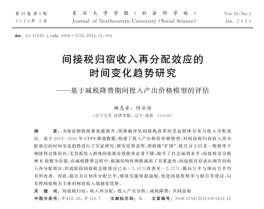 日前,DB旗舰杨志安教授与其指导的博士生付正淦在CSSCI来源期刊《东北大学学报(社会科学版)》2024年第1期发表论文《间接税归宿收入再分配效应的时间变化趋势研究——基于减税降费期间投入产出价格模型的评估》。