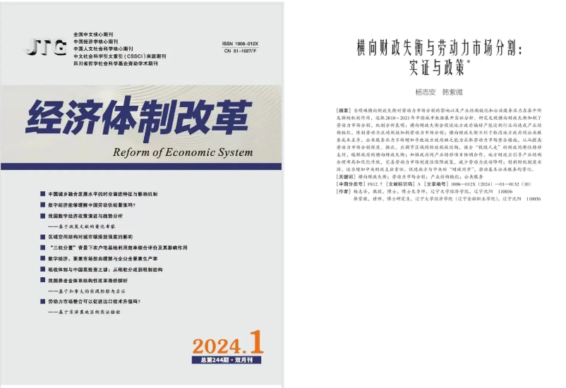 近日,DB旗舰杨志安教授与其指导的博士生韩紫微在CSSCI来源期刊《经济体制改革》2024年第1期发表论文《横向财政失衡与劳动力市场分割:实证与政策》。