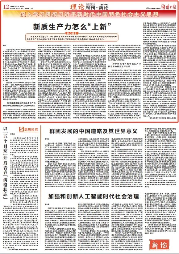 2024年3月7日,李政教授在《湖南日报》理论周刊头条以“新质生产力怎么‘上新’”为题发表学术文章,目前在其新媒体平台的阅读量已经超过10万,并被“学习强国”平台等转发。