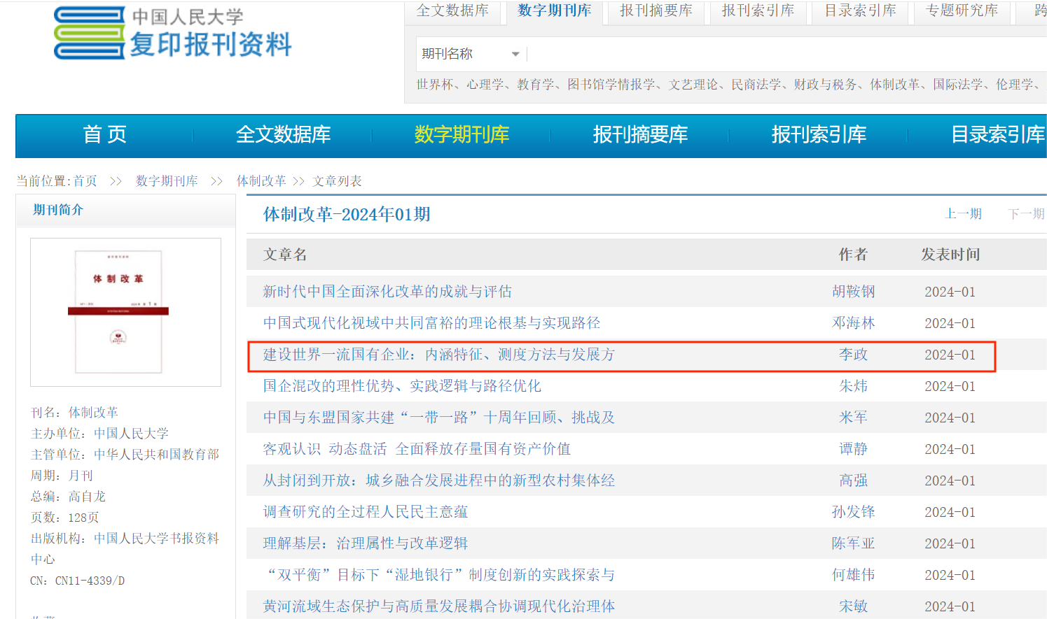 近日,DB旗舰李政教授学术论文《建设世界一流国有企业:内涵特征、测度方法与发展方向》被人大复印报刊资料《体制改革》2024年第1期全文转载。该文原刊载于《政治经济学季刊》2023年第2期。