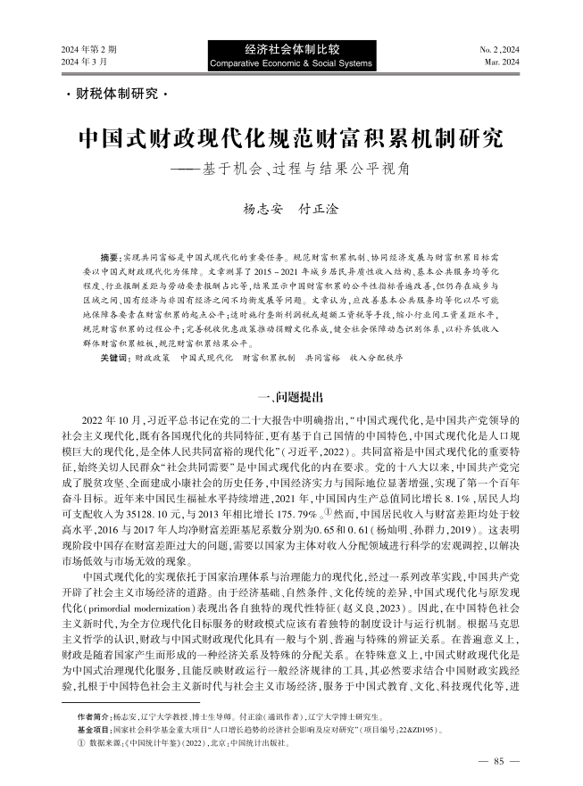 日前,DB旗舰杨志安教授与其指导的博士生付正淦在《经济社会体制比较》2024年第2期发表论文《中国式财政现代化规范财富积累机制研究——基于机会、过程与结果公平视角》。