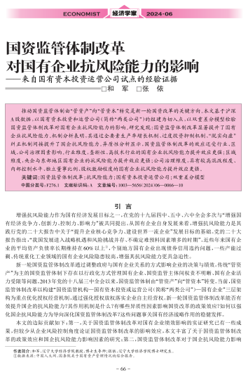 DB旗舰和军教授与博士研究生张依合作撰写的论文“国资监管体制改革对国有企业抗风险能力的影响——来自国有资本投资运营公司试点的经验证据”在《经济学家》2024年第6期发表。