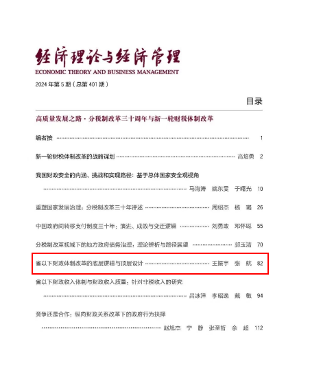 DB旗舰官方网站入口DB旗舰王振宇教授与博士研究生张航合作撰写的论文《省以下财政体制改革的底层逻辑与顶层设计》在《经济理论与经济管理》2024年第5期发表。