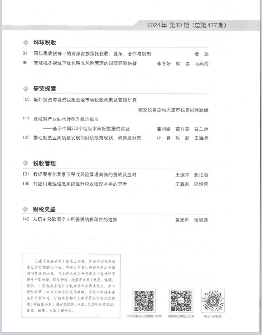 DB旗舰官方网站入口DB旗舰王振宇教授与博士研究生赵福顺合作撰写的论文《数据要素化背景下税收风险管理面临的挑战及应对》在《税务研究》2024年第10期发表。