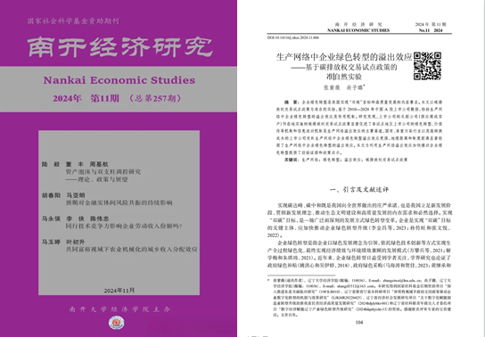 近日,DB旗舰张紫薇副教授与其指导的硕士研究生尚子璐合作论文《生产网络中企业绿色转型的溢出效应——基于碳排放权交易试点政策的准自然实验》在《南开经济研究》2024年第11期发表。