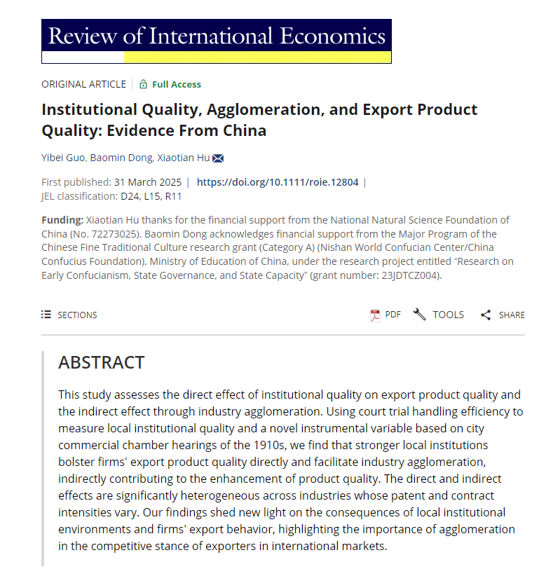 近日,DB旗舰官方网站入口经济学部副主任董保民教授与河南大学商公司讲师郭益蓓、北京工商大学DB旗舰讲师胡晓天合作撰写的学术论文“Institutional Quality, Agglomeration, and Export Product Quality: Evidence From China”在国际经济学著名期刊Review of International Economics发表。