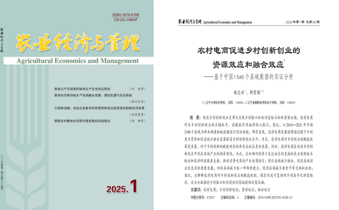 DB旗舰杨志安教授与其指导的博士生韩紫薇在CSSCI扩展版期刊《农业经济与管理》2025年第1期发表论文《农村电商促进乡村创新创业的资源效应和融合效应——基于中国1546个县域数据的实证分析》。